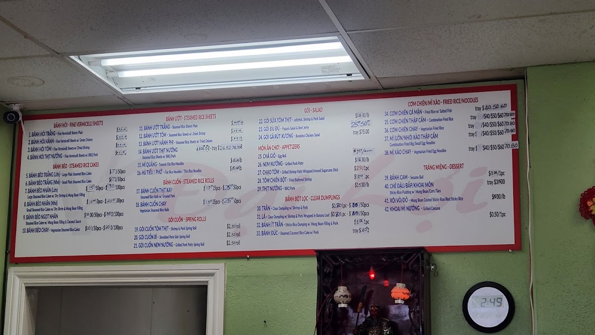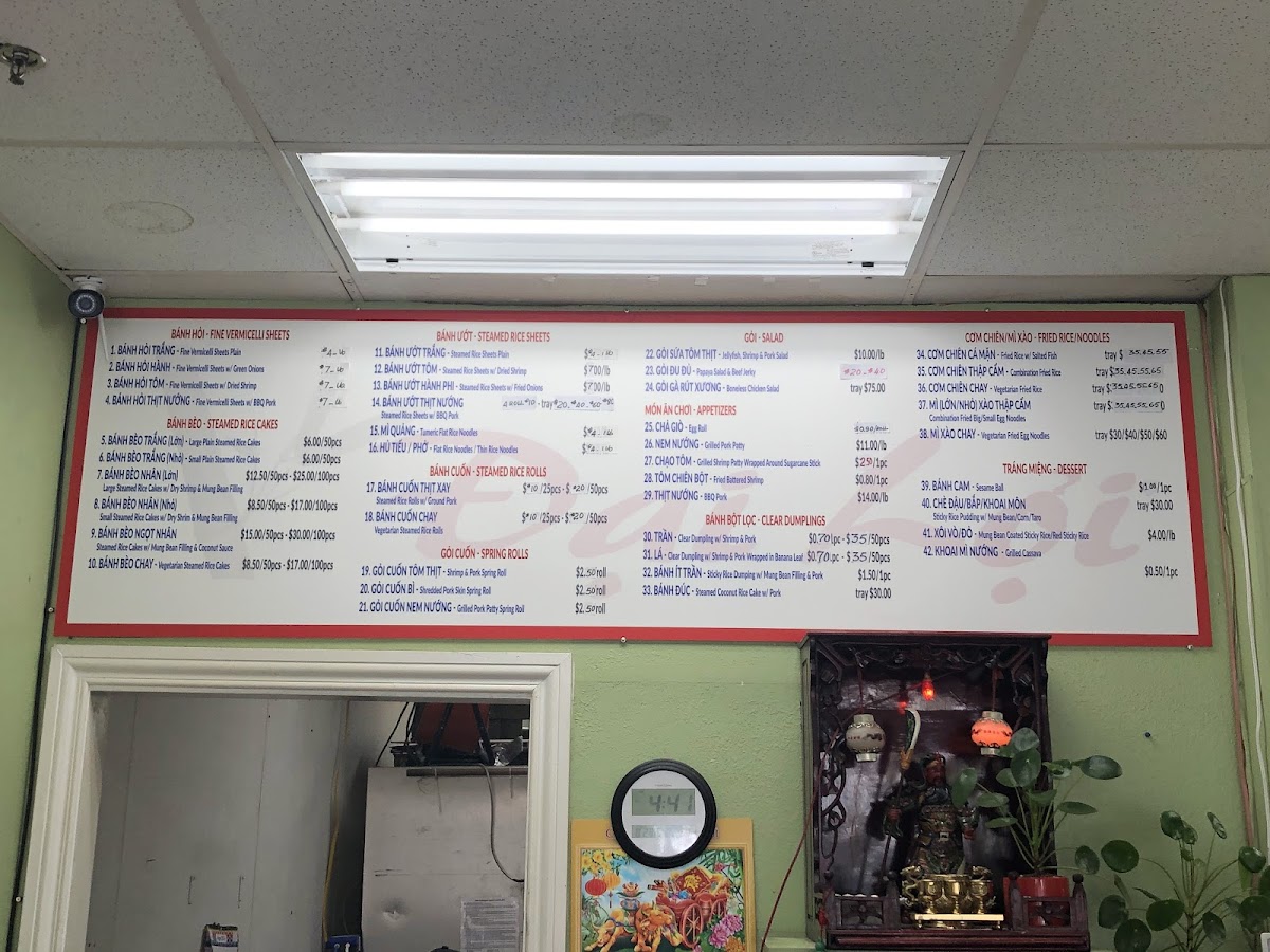 Dai Loi Bakery & Restaurant at 1969 Tully Rd in San Jose presents a menu that artfully blends traditional Vietnamese flavors with approachable options for all tastes. The Bánh Ướt selection, including Bánh Ướt Trắng (1lb), Bánh Ướt Tôm (1lb), Bánh Ướt Hành Phi (1lb), and Bánh Ướt Thịt Nướng, highlights delicate steamed rice sheets perfect for pairing with the flavorful Gà Sốt Chua Ngọt or Gà Phá Lấu. For starters, the Mix 3 Món - Bèo, Bột Lọc, Ít Trần offers a satisfying sampler, while the Bánh Bèo and Bánh Cuốn varieties, from Bánh Bèo Trắng (Nhỏ) to Bánh Cuốn Thịt Xay, deliver a comforting and authentic experience. The menu’s noodle and rice offerings, such as Cơm Chiên Chay, Cơm Chiên Thập Cẩm, and Mì Xào Thập Cẩm (Mì Nhỏ/Lớn), are hearty and flavorful. Specialty items like Dưa Món, Bánh Chưng, and Bánh Tét reflect the restaurant’s dedication to tradition, while appetizers including Chạo Tôm (4pcs), Nem Nướng (Pound), and Gỏi Cuốn Bì Thịt Nướng (Pound) bring vibrant textures and tastes. Sweet endings with Sữa Chua (10oz), Khoai Mì Nướng (3pcs), Chè Dưỡng Nhan, and Bánh Cam (2pcs) round out the menu beautifully, complemented by the delicate Bánh Bột Lọc (8pcs) and Bánh Ít Trần (4pcs). Fresh salads such as Gỏi Đu Đủ and Gỏi Sứa Tôm Thịt provide light, refreshing contrasts. Overall, the menu at Dai Loi Bakery & Restaurant is both diverse and carefully curated, offering a well-balanced journey through classic Vietnamese cuisine that satisfies both casual diners and seasoned enthusiasts.